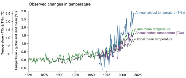 지구온난화에 따른 기온 평년 편차(Temperature-Anomaly)의 상승으로, 지구의 기후는 시간이 갈수록 폭염은 증가하고 한파는 감소하는 추세로 변화하고 있다. 아래의 그래프는 산업화의 시작인 1850년부터 2025년 현재까지의 전 지구 평균기온, 연간 최고기온 극값(TXx), 연간 최저기온 극값(TNn)의 변화를 각각 나타낸 것이다. 전 지구 평균기온은 1970년대 이후 꾸준히 증가 추세에 있고, 연간 최고기온 극값(TXx) 또한 증가추세에 있다. 그래프 상에서 가장 두드러지는 연간 최저기온 극값(TNn) 또한 1970년대 이후 빠르게 증가하고 있으며 2025년 현재에는 편차값이 +3.0℃에 달하고 있다. 연간 최고기온 극값(TXx)의 변화보다 연간 최저기온 극값(TNn)의 변화가 더 크다는 건, 지구온난화로 폭염이 증가하는 정도보다 한파가 감소하는 정도가 더욱 크다는 것이다. 즉, 지구온난화는 한파(이상 저온)의 빈도와 강도에 대해 '빠르게 감소하는 방향으로' 영향을 미치고 있는 것이다.