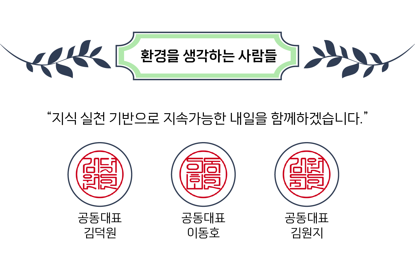 환경을 생각하는 모든 분들께 인사드립니다. 저는 환경을 생각하는 사람들의 공동대표 김덕원입니다. 환경오염과 기후위기는 더 이상 먼 미래의 이야기가 아니라 오늘 우리의 삶을 위협하는 현실이 되었습니다. 그러나 저는 이 위기를 학습과 탐구, 그리고 시민과의 연대를 통해 새로운 가능성으로 전환할 수 있다고 믿습니다.