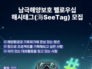 🌊 남극해양보호 펠로우십 해시태그(海SeeTag) 모집 바다(海)를 보고(See),문제를 세상에 태그(Tag)하다. 남극과 남극해는 기후위기의 최전선이자지구 생태계를 지탱하는 푸...